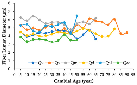 The fiber and lumen diameters in mature wood were wider than those in juvenile wood, except for the lumen diameter of Qm. There were no significant differences in the lumen diameters of juvenile and mature wood between the Qal. Our findings on fiber and lumen diameters align with those of previous studies reported by Zobel and Sprague [41] and Barbour [38], which indicated that mature wood tends to have wider lumens and cells than juvenile wood.