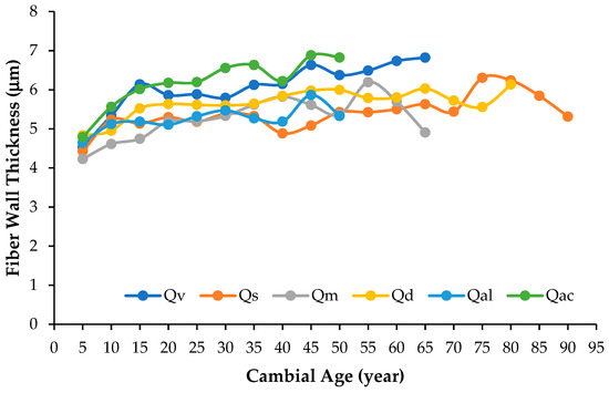 Among the six oak species, there was variation in the average fiber wall thickness, Qac had the thickest fiber walls at 6.2 μm, whereas Qal had the thinnest walls at 5.2 μm. There were no significant differences in the fiber wall thickness among Qs, Qm, and Qal.