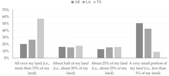 When asked about whether they had ever seen any feral swine or signs of feral swine on their property, most of the respondents (over 80%) reported Yes. Therefore, a follow-up question was asked to identify the extent to which they noticed feral swine on their land, which included four options: “all over my land (i.e., more than 75% of my land)”, “about half of my land (i.e., about 50% of my land)”, “about 25% of my land (i.e., about 25% of my land)”, and “a very small portion of my land (i.e., less than 5% of my land)”. The descriptive statistics are summarized in Figure 1. Over half of the respondents (57.3%) from ETX reported that they noticed feral swine or the signs of feral swine on all of their land, whereas this percentage was 26.6% in LA and only about one-fifth (20.3%) in AR. By contrast, over half (50.6%) of the respondents from AR reported a very small portion of their land with signs of feral swine presence, being 42.5% in LA and 9% in ETX.