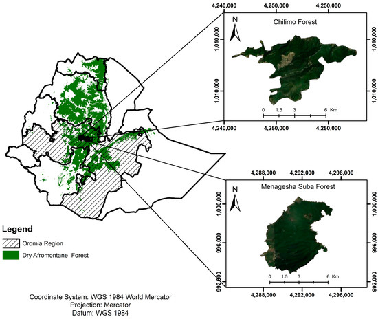 Map of the study area overlaid with the distribution map of dry Afromontane forests, following Friis et al. [41].