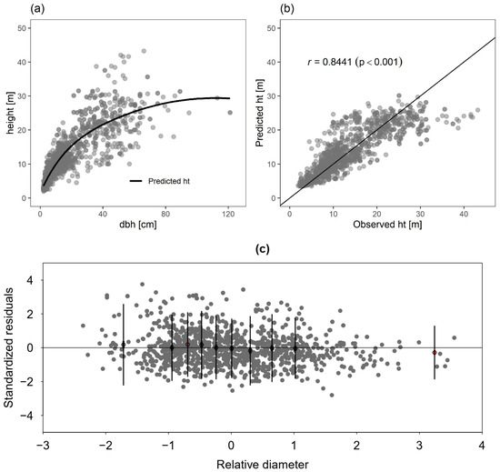 Height and diameter relationship (a), observed versus predicted height (b), and the residuals distribution graphs (c) of Juniperus procera trees using the Michaelis–Menten model. The gray dots in (a) represent the observed height–diameter data, and the line represents the average population curve. The grey dots in (c) show the standardized residuals; the empty circles show the means of residuals of the diameter classes. The thin vertical lines show the confidence interval of each observation, and the thick vertical lines show the 95% confidence interval for the class mean. The thick lines that do not cross the horizontal line at y = 0 are highlighted in red.