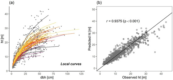 The relationship between tree height and stem diameter has been described using a variety of mathematical functions, and several nonlinear model forms have been statistically tested to describe the allometry behind this complex relationship (e.g., [9,55,56]). Some models are grounded in sound theory, while others are purely empirical. The power law function is the most common model, based on many theoretical arguments [14]. Mehtatalo and Lappi [57] suggested that flexibility and parsimony (i.e., combining simplicity with high predictive or explanatory power) should be considered in addition to the parameter’s obvious biological interpretability when choosing the best function. For the needs of the current study, we evaluated 14 local nonlinear functions (Table 2) that have been widely used to describe the height–diameter relationships of trees from both plantation and natural forests growing in different regions [15,28,58,59,60], and the best model was referred to as the base model.
