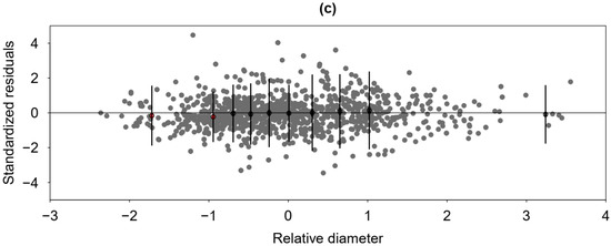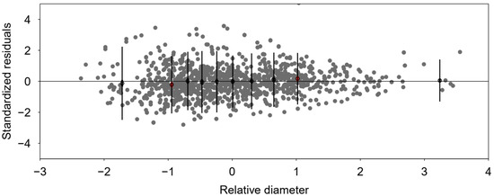 Residuals distribution graph using the generalized mixed-effects model (M4). The grey dots indicate the standardized residuals; the open circles indicate the means of residuals for each diameter class. The thin vertical lines show the confidence interval of each observation, and the thick vertical lines show the 95% confidence interval for the class mean. The thick lines that do not cross the horizontal line at y = 0 are highlighted in red.