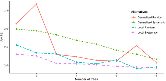 Graphical representation of the RMSE values for the calibration response associated with sampling alternatives A8 and A9. The solid red line represents the results obtained when applying the random tree selection alternative with the generalized mixed-effects model, whereas the green dotted line illustrates the results of the systematic tree selection alternative using the same model. In contrast, the dashed blue line represents the results of using the random tree selection alternative with the local mixed-effects model, whereas the purple dashed line represents the results of using a systematic tree selection alternative for the same model.
