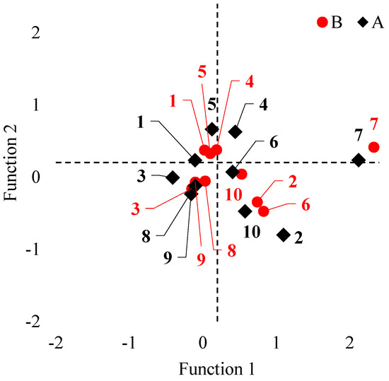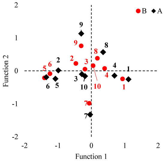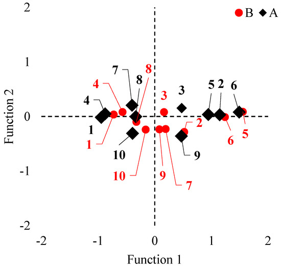 The values of the group centroids for the discriminant functions correlated with the variables for each species’ express differences for each treatment, from −1.351 to 1.132 in A, and −1.404 to 0.934 in B (Table A3).