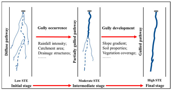 Once discharged from the road surface, sediment-laden runoff proceeds downhill toward the stream, initiating slope erosion and the creation of sediment transport routes connecting the road to the stream [15]. Typically, these established sediment transport pathways can be classified into three main categories: diffuse pathways, gully pathways, and partially gullied pathways (Figure 5) [16].