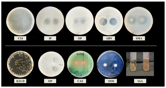 The morphology and function of strain K22-D and CS3. Note: IP (inorganic phosphorus medium), OP (organic phosphorus medium), CAS (chrome azurol S assay), ABN (Ashby’s medium), SMA (skimmed milk agar), SSM (soluble starch medium), IAA (indole acetic acid).