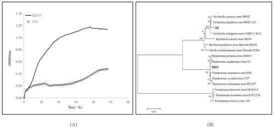 Phylogenetic tree and growth curves of strain K22-D and CS3. Growth curves OD600 (A); Phylogenetic tree (B).