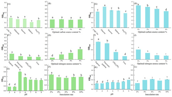 Optimization results of strain CS3 (A–F) and K22-D (G–L). Note: different lowercase letters indicate significant differences between treatments at p < 0.05.