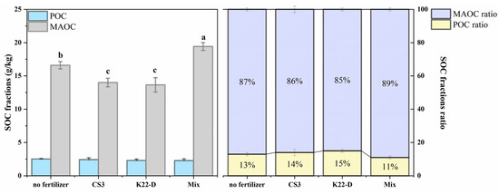 In the mixed-bacterial fertilizers, the SOC content was significantly higher (by 13.55%) than that of no-fertilizer group and lower in the K22-D and CS3 groups than in no-fertilizer group. The MAOC content in the mixed-bacterial fertilizers was higher than that in no-fertilizer, and that in the single-bacterial fertilizers was lower than that in no-fertilizer. The POC content did not change significantly in the microbial fertilizers (p > 0.05) (Figure 5).