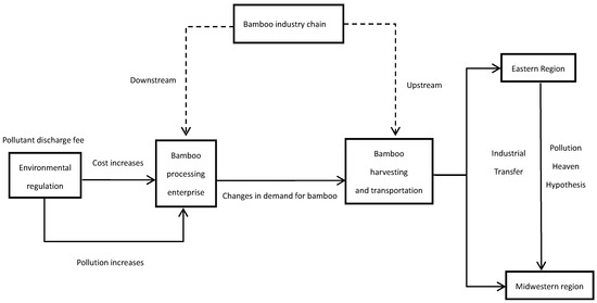 As the international community cares more about environmental preservation, high-emission enterprises are facing stricter environmental regulation. The Pollution Haven Hypothesis posits that stringent environmental regulations in a country may prompt the relocation of pollution-intensive industries to countries with less rigorous regulations, affecting the geographical distribution of industrial production and international trade [43]. This is exemplified by the potential restructuring and spatial redistribution of pollution-intensive industries, as they may shift from countries and regions with stringent environmental regulations to those with comparatively lower environmental standards [44]. Eastern China has advanced socioeconomic development and a well-established bamboo industry, so the rapid growth of the industry has brought environmental challenges. Therefore, stringent environmental regulations have been issued to address the challenges. This, however, has put more constraints on the economic activities of the local bamboo industry. So, some polluting enterprises in Eastern China may relocate to central and western regions where pollution treatment costs are less prohibitive. Thus, we proposed the following hypothesis: