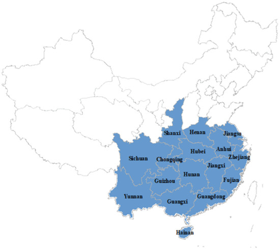 Given both the socioeconomic development and geographical location, the 16 provinces are categorized into three regions: eastern areas (5 provinces: Jiangsu; Fujian; Zhejiang; Guangdong; and Hainan); central regions (5 provinces: Jiangxi; Anhui; Henan; Hubei; and Hunan); and western regions (6 provinces/cities: Shanxi; Sichuan; Chongqing; Guizhou; Yunnan; and Guangxi)—Heilongjiang, Jilin, Inner Mongolia, and Xinjiang are not included, because bamboo forests are not mainly planted in these three provinces. From the economic statistic data of all 16 case provinces (Table 1), it can be found that the average per capita GDP and net income of farmers are USD 15,520 and 3718 in eastern provinces, respectively, which is much higher than in central and western provinces.