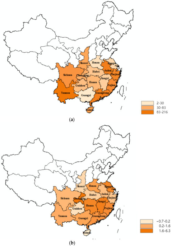 Growth rate of bamboo harvesting and transportation output value in 16 provinces during 2000–2010 and 2010–2020 (%). (a) 2000–2010. (b) 2010–2020.