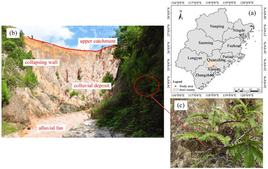 (a) Study area. (b) Benggang and its composition. (c) Dicranopteris linearis.