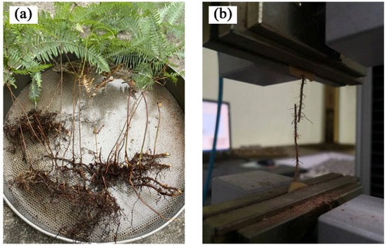 In the study area, a collapsing wall with a well-developed soil layer and uniform growth of Dicranopteris linearis was selected. Three plots with a height of 3 m and a width of 1 m were tested in the collapsing wall, and each plot was divided into three parts with a height of 1 m and a width of 1 m to investigate the biology of Dicranopteris linearis. The investigation results showed that the coverage of Dicranopteris linearis was 95%, and the average plant height, underground root depth and average root weight density were 0.28 m, 0.2 m and 75 g 0.01 m−3, respectively. After the survey, the roots of well-growing Dicranopteris linearis were collected by the excavation method [36]. To prevent the water loss of roots during transportation, the collected root samples were covered with fresh soil, wrapped in a foam box, and quickly transported to the laboratory. After cleaning (Figure 2a), half of the samples was trimmed into 2 cm root segments for rooted soil preparation according to the size of the shear ring. Meanwhile, roots that were straight, uniform and free of diseases were selected for the tensile test (Figure 2b). The root tensile test was carried out by an electronic fabric tension machine (the instrument test force range was 0~2500 N). The results showed that the average root diameter and tensile strength of Dicranopteris linearis were 0.49 ± 0.18 mm and 18.42 ± 9.36 MPa, respectively.