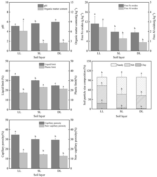 A complete collapsing wall was selected in the study area, and 2 cm thick soil was scraped off with a small flat shovel. According to the soil weathering degree and the color characteristics, the collapsing wall was divided into three layers: a lateritic layer (LL), a sandy layer (SL) and a detritus layer (DL) [23,26]. Among them, the LL was red, with good aggregation, a compact structure, and completely weathered feldspar and mica. The SL was light red to grey white, there were large quartz sand particles, and the soil structure was loose. The DL was greyish white and contained considerable quartz sand. The mica minerals that were not completely weathered combined with quartz to maintain the primary granite structure. To avoid contamination, multipoint mixing was adopted to collect the DL, SL and LL from bottom to top (Figure 3). Samples were mixed, numbered, air-dried and screened back to the laboratory for follow-up tests. The soil pH, soil mechanical composition, soil organic matter (SOM) and free Fe and Al oxides were determined according to Zhou et al. [19]. Soil liquid and plastic limits were measured according to Duan et al. [26]. The properties of the soil are as follows (Figure 4).