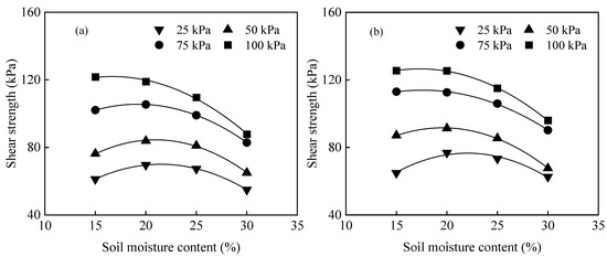 Under four stress forces, the relationship between the shear strength and the SMC of collapsing wall soils is shown in Figure 5. The shear strength of the rooted soil and plain soil decreased with increasing SMC. When the SMC increased from 15% to 30%, the shear strength of the LL rooted soil decreased from 113 and 126 kPa to 90 and 96 kPa, respectively (under 75 and 100 kPa normal stress). Under 25, 50, 75 and 100 kPa normal stress, the shear strength of SL rooted soil decreased by 26.98%, 21.53%, 21.08% and 18.25%, respectively, and the shear strength of DL rooted soil decreased by 19.04%~27.22%. In contrast, in the initial stage of SMC increase, the shear strength of the LL increased from 65 and 86 kPa to 77 and 91 kPa, respectively. When the SMC increased from 20% to 30%, the shear strength decreased by 18.62% and 25.89%, under 25 and 50 kPa normal stress, respectively.