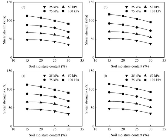 where m is the mass of wet soil (g), w1 is the SMC of wet soil (%), ρ is the constant, 1.35 g cm−3 in this experiment, and v is the volume of the shearing ring (cm3).