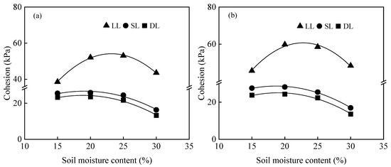 The relationship between soil cohesion and SMC is shown in Figure 6. This regularity of cohesion and SMC are similar in the rooted soil and plain soil, first increasing and then decreasing with increasing SMC. When the SMC increased from 15% to 20% (Figure 5b), the cohesion of the rooted soil in the LL, SL and DL increased from 46, 28 and 24 kPa to 60, 28 and 24 kPa, and the cohesion increased by 23.6% 2.20% and 2.20%, respectively. When the SMC increased from 20% to 30%, the cohesion of the rooted soil in the LL, SL and DL decreased from 60, 28 and 24 kPa to 48, 17 and 14 kPa, with decrease rates of 19.10%, 39.88% and 44.10%, respectively.