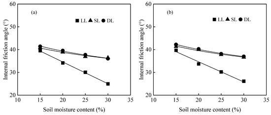 The soil internal friction angle is an essential index reflecting soil shear resistance [45]. We found that the friction angles of the rooted collapsing wall soils decreased as the SMC increased. The results were similar to those of Li et al. [49], who discussed the influence of SMC on the friction angle of the rooted soil of Caragana korshinskii Kom., Nitraria sphaerocarpa Maxim., Achnatherum splendens (Trin.) Nevski, and Agropyron trachycaulum Linn. Gaertn. The internal friction angle was determined by the degree of mosaicism and locking between particles. At low SMC, the friction bite force was good [21]. As the SMC went up, the pore water content of the soil increased, the friction between the soil particles and water membrane gradually dominated and the soil friction coefficient decreased [27]. Saravanan et al. [50] considered that high SMC altered the contact state and structural arrangement of soil particles and significantly affected the macroscopic properties of soil. In the three layers, the attenuation of the internal friction angle in the LL is higher than that in the SL and DL. This may be because the content of fine particles in LL is greater, and the effective contact area between particles is larger, which facilitates water membrane structure formation and directly promotes particle lubrication. However, in the SL and DL, the content of soil coarse particles was rich, and the rough structure of the particle surface was less affected by SMC [51,52].
