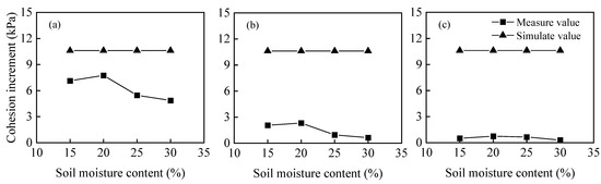 The relationship between the cohesion increment predicted by the WWM and the measured cohesion increment and SMC was compared (Figure 8). When the SMC increased from 15% to 30%, the cohesion increment of the three composites increased at first and then decreased, while the cohesion increment predicted by the WWM did not change and was exactly the same (10.61 kPa). The simulated cohesion increment is higher than the measured cohesion increment, and the average overestimation degree is the lowest in the LL (1.7 times), followed by the SL (9.4 times) and finally the DL (21.7 times).