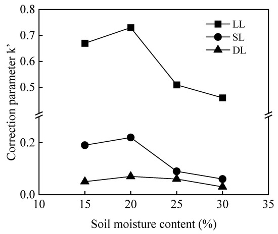 The relationship between k’ and SMC is shown in Figure 9. It can be seen that k’ is between 0.03 and 0.73, and it first increases and then declines as SMC increases. The is 0.59 in the LL, 0.14 in the SL and 0.05 in the DL.
