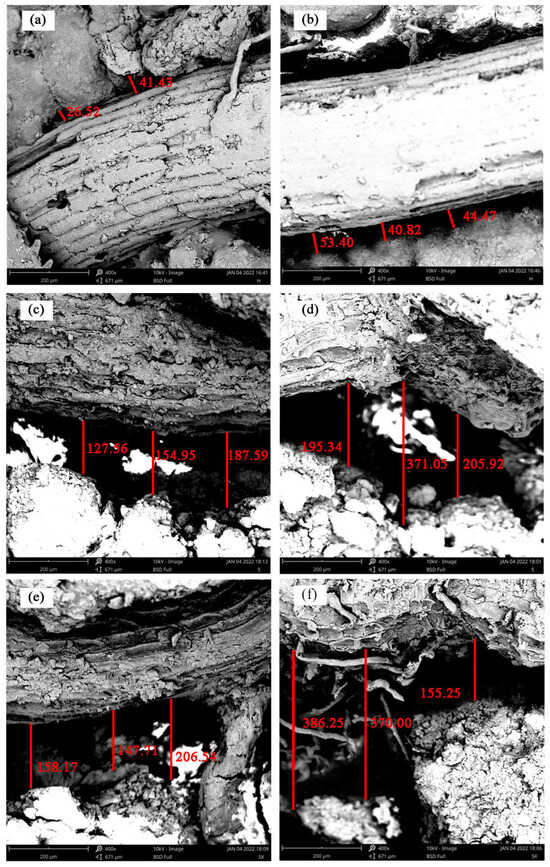 There were obvious differences in the cohesion characteristics of LL, SL and DL. First, the responses of the three rooted soils to the SMC were different. The cohesion of the LL increased the most when water was added, and the decreased in SL and DL was the largest with high SMC. Second, when the SMC increased, the additional cohesion of roots became lower, and the degree of weakening was high in the SL and DL. The difference in soil properties could explain this result [19,20,23]. Compared with the LL, the weathering degree of the SL and DL is lower, the soil particle composition is dominated by sand, the content of soil cementing material is less (Figure 3) and the water holding capacity is poor. In addition, electron microscope scanning found that the connection tightness between roots and soil was LL > SL > DL (Figure 10a,c,e). However, when the SMC increased from 20% to 25%, the connection distance between the root of the LL, SL and DL increased by 1.4, 1.6 and 1.7 times, respectively (Figure 10b,d,f). This indicated that the SMC has a greater negative effect on the connection of the SL and DL, and the additional cohesion of the root system was weakened more.