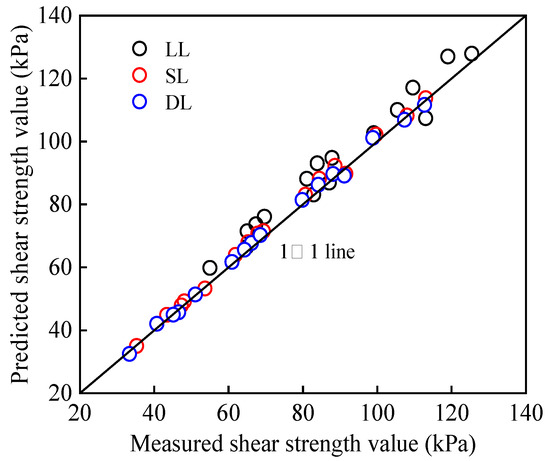 where NSE is the Nash–Sutcliffe efficiency coefficient and R2 is the determining coefficient. Mi and Pi represent the true and predicted shear strengths of i, respectively. and are the mean values of the true and the predicted shear strengths, respectively. The closer the NSE is to 1, the better the fitting effect of the model.