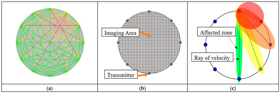 An ellipse-based spatial interpolation (EBSI) method for image reconstruction has been developed in recent years based on the visualization of propagation rays [37]. It can achieve relatively good imaging results and has become a typical tomography algorithm in this field [26,38,39]. As shown in Figure 1c, each ray affects the surrounding area (called the affected zone), and the shape of the affected zone is elliptical. The value of the grid cells in the affected zone is equal to the value of the corresponding ray. If a certain grid cell is in several affected zones simultaneously, the value of this grid cell will be determined by the value of those affected zones using different strategies [37,38,40]. The tomography result of this graphic analysis-based method can reflect the location and severity of defects. In addition, the ray graph provides input data for the EBSI method, visualized by normalized stress wave velocity data, so the method is appropriate for tree trunks with different moisture contents.