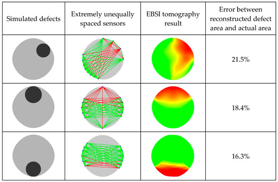 According to the results shown in Figure 3, it can be seen that when sensors are extremely unequally spaced, the tomographic imaging effect is significantly poor. This indicates that, if several sensors are densely placed in extremely close positions, it will result in unfavorable multi-angle observations with respect to stress wave signals, which is consistent with Liang’s and Wang’s research conclusions [23,41].