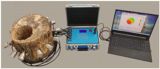 In the experiment, a self-developed stress wave signal acquisition instrument named Wopecker (v2.0, Hangzhou, China) was adopted. The experimental setup is shown in Figure 7. The instrument consists of 12 stress wave sensors, a signal processor unit, software, an electronic hammer, and several data wires. When performing stress wave imaging on hardwood samples, we place 12 piezoelectric-type sensors at certain cross-sections of the tree trunk and knock each sensor in sequence, and the remaining sensors receive the generated stress wave signals. Next, the signal processing unit analyzes the received signal based on digital signal processing technology (short-time energy and double threshold detection are used to estimate the stress wave propagation time), and the corresponding stress wave propagation time matrix is obtained. The signal processing box then transmits the time matrix to the computer (CPU: Intel Core i3 2.10 GHz; RAM: 8 GB) through a USB connection. The distance between any pair of sensors is known, so the complete velocity matrix can be displayed and calculated by the self-developed software (v2.0, Hangzhou, China) as the input data of the proposed method.