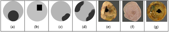 Simulated and real samples: (a) one-circle pattern; (b) one-rectangle pattern; (c) one-edge pattern; (d) two-edge pattern; (e) tree trunk with holes; (f) tree trunk with knots; (g) tree trunk with holes.