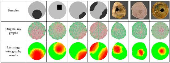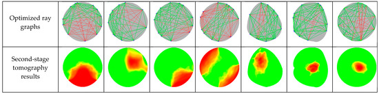 The initial population size in the proposed algorithm is 200, with a maximum selection probability of 80%, a maximum exchange probability of 25%, and a maximum mutation probability of 5%, and the maximum number of iterations is 50. The defect samples, original ray graphs, first-stage tomography results, optimized ray graphs, and second-stage tomography results are shown in Figure 9.