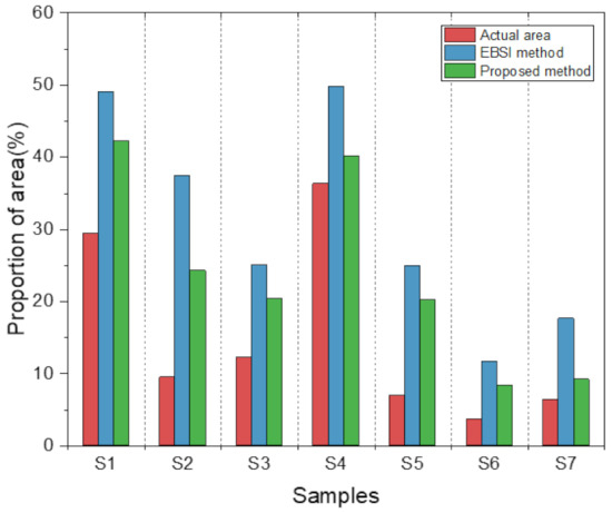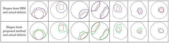 To quantitatively evaluate the sensor position’s optimization algorithm based on the defect distribution perception proposed in this paper, we obtained the reconstructed defective area using the OTSU image segmentation method before and after sensor position’s optimization. The comparison results are presented in Figure 10. It can be seen that all the areas obtained using the proposed method are closer to the areas of the actual area than those derived using the original EBSI method.