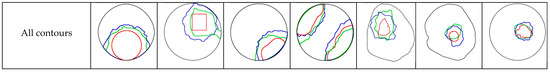To analyze the experimental results of stress wave tomography more accurately, we extracted the contours of the reconstructed defects before and after sensor position’s optimization, and we compared them with the actual contours of the internal defects using Photoshop software (v2022). The comparison result is shown in Figure 12.