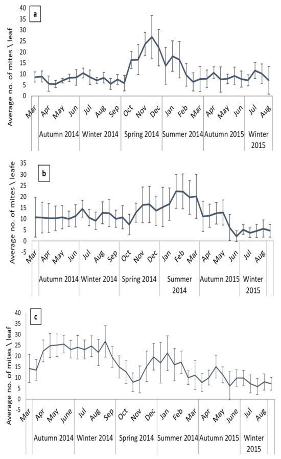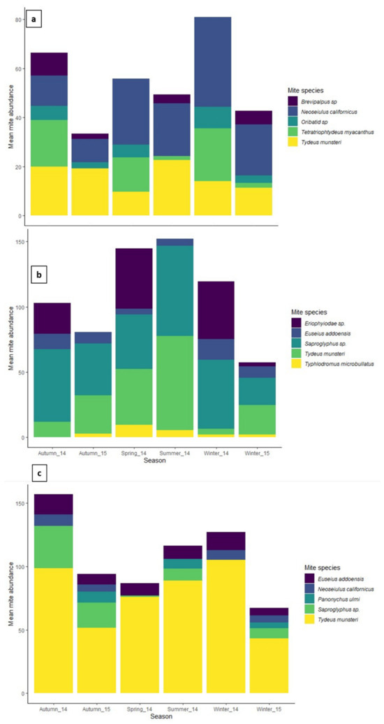 Mites are distinct species of minute arthropods with an average body length ranging from 100 μm to 5 mm [1]. They are widely distributed [2,3] in all environments and are the second most abundant and diverse group after insects [2]. Unlike insects, however, mites have received less attention, and studies documenting seasonal changes in mite abundance and diversity are few and far between. Mites are believed to be mainly affected by temperature and relative humidity [4,5], and changes in seasons play an important role in structuring mite assemblages [5,6]. In the tropics, the survival of predatory mites during the dry seasons is negatively influenced by low relative humidity, and at extremely low levels of humidity, about 50% of the predatory mites’ eggs die [6]. In addition, temperature plays a role in mite life histories; elevated temperatures shortened the developmental time of phytoseiid mites while low temperatures lengthened it, resulting in high mite abundance during the hot periods [7,8,9]. In temperate zones, mites appear on deciduous trees annually in spring, and the diversity of these communities changes every season. Seasonal changes are sometimes driven by vegetation, the overall greenness of the plant [5,10], the availability of food and fungal flora, and leaf architecture [7]. A study on four varieties of grapes with different leaf architecture documented high densities of phytoseiid mites from late April to late June during spring and low densities in September and October in the autumn months in vineyards [11,12]. Nishida [8] reported a higher number of mites in leaves with domatia in summer than in plant leaves without domatia, suggesting that this leaf structure influences mite abundance. The shrub Viburnum erosum Thumb. had fungivorous mite species from the Winterchmidtidae and Tydeoidae families continuously throughout the sampling season from March to November. Phytoseiid mites were found within the domatia of this plant from May to November, and Eriophyioid mites were found in the domatia only in spring and autumn [13].