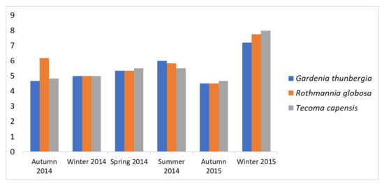 Mite species richness also varied slightly throughout the sampling period (Figure 2). In the autumn season of 2014, R. globosa had the highest number of mite species compared to the other two trees. All plants sampled had the same number of mite species in the winter of 2014. Species richness was lowest in the autumn of 2015 and highest in the winter of 2015 in the three plants.