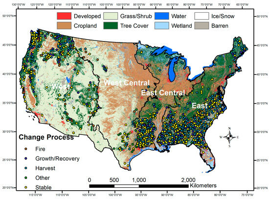 LCMAP Primary Land Cover (2000) [38] indicating the four mega-regions of CONUS (black boundary). Points on map are location information from the map validation reference data showing the distribution of change processes affecting tree cover change during 1986–2018.