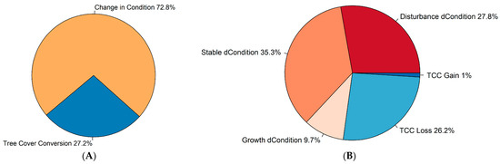 (A) Overall proportion of CCDC harmonic model breaks corresponding to reference plots that were either tree cover conversion (TCC) or change in tree cover condition for 1986–2018 study period; (B) separation of identified CCDC harmonic model breaks into either disturbance related or not. Note: dCondition = change in condition; TCC Loss = tree cover conversion resulting in tree cover loss; TCC Gain = tree cover conversion resulting in tree cover gain.
