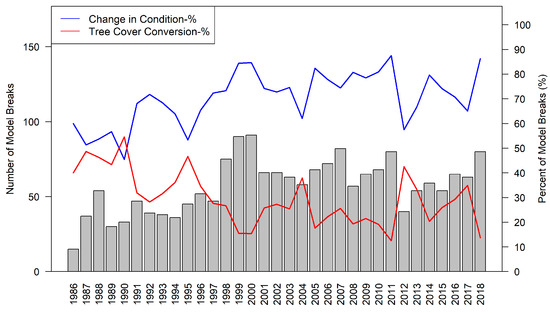 Figure 4 shows the annual number of CCDC harmonic model breaks corresponding to reference plots that were related to the tree cover conversion during the 1986–2018 study period. The number of time-series breakpoints peaked around 1999 and 2000. The number of time-series breaks was moderately high in the 2000s and ticked up again towards the end of the study period. Time-series breakpoints related to tree cover conversion were high in the early part of the study period into the mid-1990s but came down moderately and fluctuated within a narrow range in the 2000s until the end of the study period. Breakpoints related to tree cover change in condition generally increased from the beginning to the end of the study period, although there were annual fluctuations especially after the year 2000.
