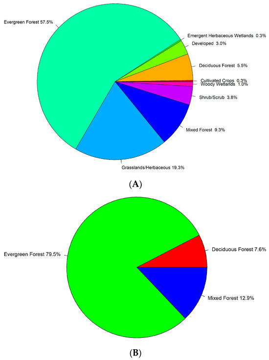 Figure 5 shows the distribution of tree cover-linked CCDC harmonic model breaks by forest type per NLCD landcover (2019 version) for the years when maps were available during the study period. As indicated in Figure 5A, most of the CCDC harmonic model breaks were detected in evergreen forest (57.5%), followed by grasslands/herbaceous (19.3%), mixed forest (9.3) and deciduous forest (5.5%). When considering the CCDC harmonic model breaks just for the three forest classes, 79.5% were detected in evergreen forest, 12.8% in mixed forest and 7.6% in deciduous forest (Figure 5B). The large number of CCDC harmonic model breaks corresponding to the grasslands/herbaceous class is likely due to errors in agreement between NLCD and LCMAP and/or mismatch in dates of tree cover changing events.