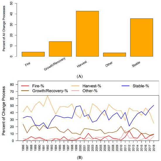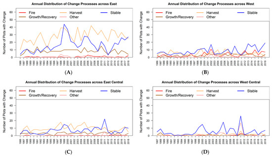 Analysis of the reference data change processes indicate that overall, across the CONUS, harvest dominated the change process (42.7%), followed by stable (35.7%), growth/recovery (14%), fire (4.2%) and other (3.4%) (Figure 6A). There were interannual variation in the dominance of change processes (Figure 6B). There was also regional variability in the types of change and change processes that were associated with tree cover disturbances (Figure 7). The reference dataset indicates that across the four CONUS mega-regions, leading change processes were harvest in the east and east-central regions (Figure 7A,C), while wildfires and harvest dominated in the west (Figure 7B). In the west, harvest used to dominate but wildfires picked up from the 2000s and were elevated to the end of the study period (Figure 7B). In the east, the predominance of harvest was evident throughout the study period (Figure 7A). A substantial proportion of the time-series model breaks were identified as stable, and this change process dominated for many years in all the mega-regions, especially in the west and west-central (Figure 7B,D).
