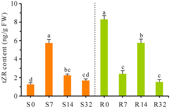 Dynamic changes of trans-zeatin riboside (tZR) during grafting. S0, S7, S14, and S32 represent the scion tissues collected 0, 7, 14, and 32 days after grafting. R0, R7, R14, and R32 indicate the rootstock tissues collected 0, 7, 14, and 32 days after grafting. The significance of the differences was calculated individually for both tissues, and different letters indicate significant differences between means.