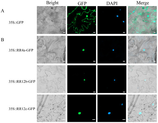 The predicted molecular weight (MW) and theoretical isoelectric point (PI) of CiRRs were analyzed using an online tool, ExPASy (https://web.expasy.org/protparam/, accessed on 26 April 2023). The subcellular localization of CiRR was predicted with Plant-mPLoc (http://www.csbio.sjtu.edu.cn/bioinf/plant-multi/#, accessed on 26 April 2023) [27]. To validate the subcellular localization prediction, the open reading frames (ORFs) without stop codons of three CiRRs (CiRR4a, CiRR12b, and CiRR12c) were cloned upstream of the enhanced green fluorescent protein (eGFP) gene in the p2GWF7.0 vector. The used primers are provided in Table S1. Fusion expression was performed in tobacco (Nicotiana benthamiana) using Agrobacterium tumefaciens GV3101. An empty vector carrying the 35S::GFP fusion protein was applied as the control. Transformation of the vector into tobacco leaf epidermal cells was conducted as previously reported [28]. The fluorescence signal was monitored after two days of transformation via a confocal laser scanning microscope (Zeiss, Jena, German).