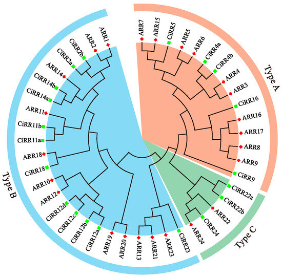 According to the gene structure analysis (Figure 5), the exon–intron patterns in type B genes were variable, with exon numbers varying from five (CiRR23) to eleven (CiRR18). Most of the type B members (eight out of twelve) contained six exons, which were divided by five introns. For the genes within the type C group, the number of exons in the ORFs was conserved, both spanning two exons. As for the type A genes, they showed similar exon–intron patterns, which were all composed of five exons and four introns. The domain detection result indicate that all of the CiRR proteins embraced receiver (REC) superfamily domains, and the specific domains for the type A, B, and C members were separately REC_typeA_ARR, REC_typeB_ARR-like, and REC_hyHK_CKI1_RcsC-like (Figure 5B).