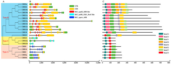Structure and conserved domain analysis of CiRRs. (A) Phylogenetic relationship among the CiRRs and (B) exon–intron structure of the CiRRs. The black line stands for the intron. Green, yellow, red, light blue, and dark blue boxes represent the untranslated region, the exon region excluding the conserved domain, the REC_typeB_ARR-like domain, the REC_hyHK_CKI1_RcsC-like domain, and the REC_typeA_ARR domain, respectively. (C) Motifs identification for CiRR proteins. Different colored boxes represent different conserved motifs.