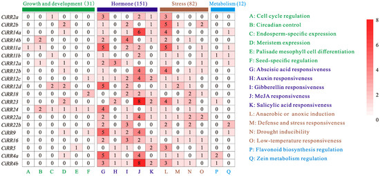 Cis-regulatory element analysis of CiRR promoters. Cis-elements are grouped into four functional categories, including growth and development, hormones, stress, and metabolism. The number represent the total number of cis-acting element in the promoter regions.