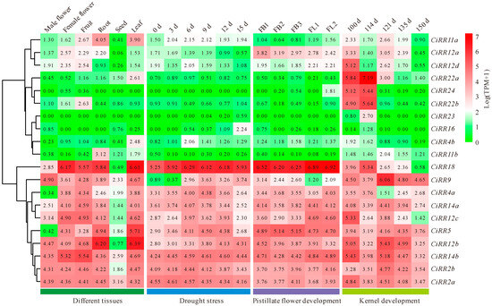Expression patterns of CiRRs. The different tissues include male flower, female flower, fruit, root, seed, and leaf. Drought stress samples were collected at 0, 3, 6, 9, 12, and 15 days (d) of water deficit. The pistillate flower development samples are the five stages of flower bud 1 (FB1), FB2, FB3, flower 1 (FL1), and FL2 in timing order. The kernel development samples are the developing kernels collected 100, 114, 121, 135, and 150 d after pistillate flower full bloom. The expression value is normalized as transcripts per million (TPM), and the heatmap is constructed based on log(TPM + 1).