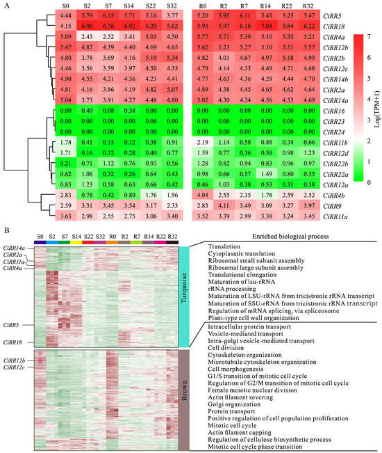 Expression profile of CiRRs and their associated co-expression genes during grafting. (A) Expressions patterns of CiRRs during grafting. The expression value is normalized as transcripts per million (TPM), and the heatmap is constructed based on log(TPM + 1). (B) Co-expression networks centered around CiRRs. The gene pattern is the Z-score normalized. S0, S2, S7, S14, S22, and S32 represent the scion tissues collected 0, 2, 7, 14, 22, and 32 days after grafting. R0, R2, R7, R14, R22, and R32 indicate the rootstock tissues collected 0, 2, 7, 14, 22, and 32 days after grafting.