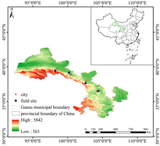 Distribution of sampling sites of investigated plants in the desert of Gansu, China.